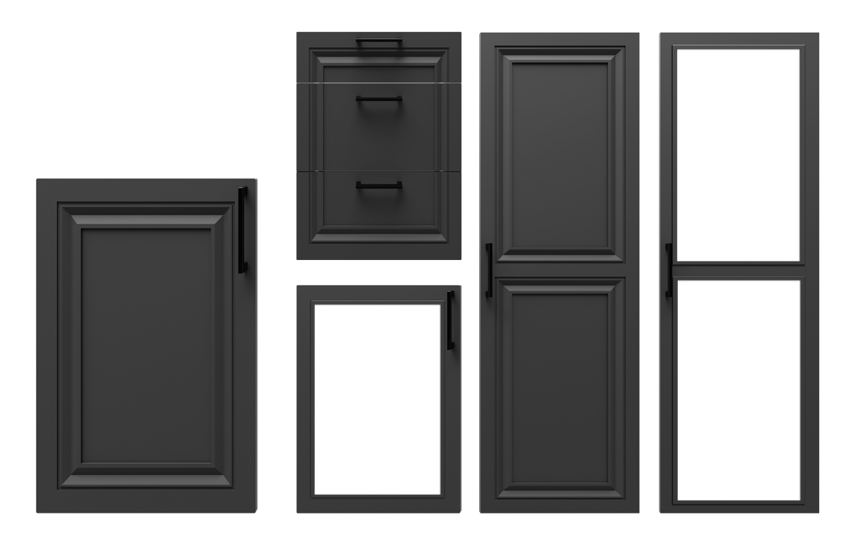 Kapak, çekmece, camlı kapak, boydan kapak ve boydan camlı kapak seçenekleri.