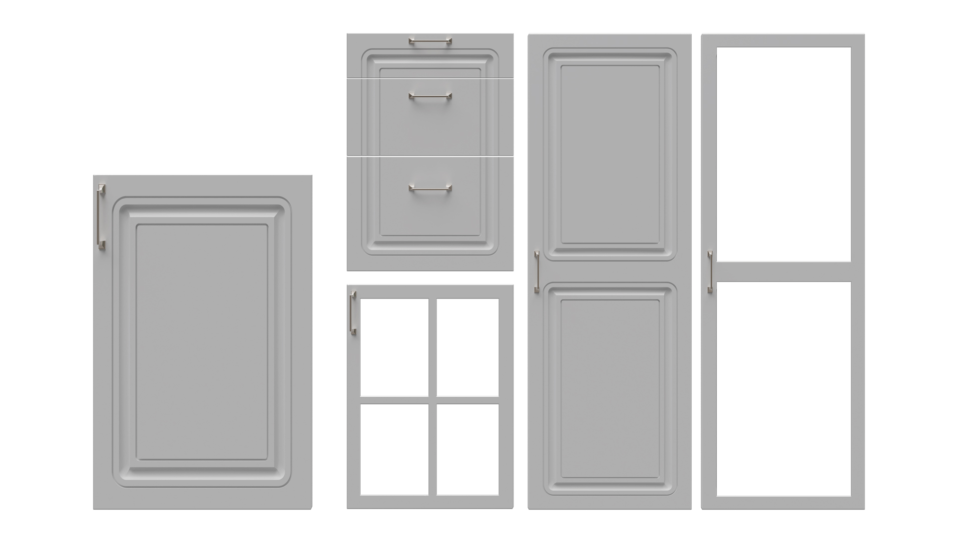 Kapak, çekmece, camlı kapak, boydan kapak ve boydan camlı kapak seçenekleri.
