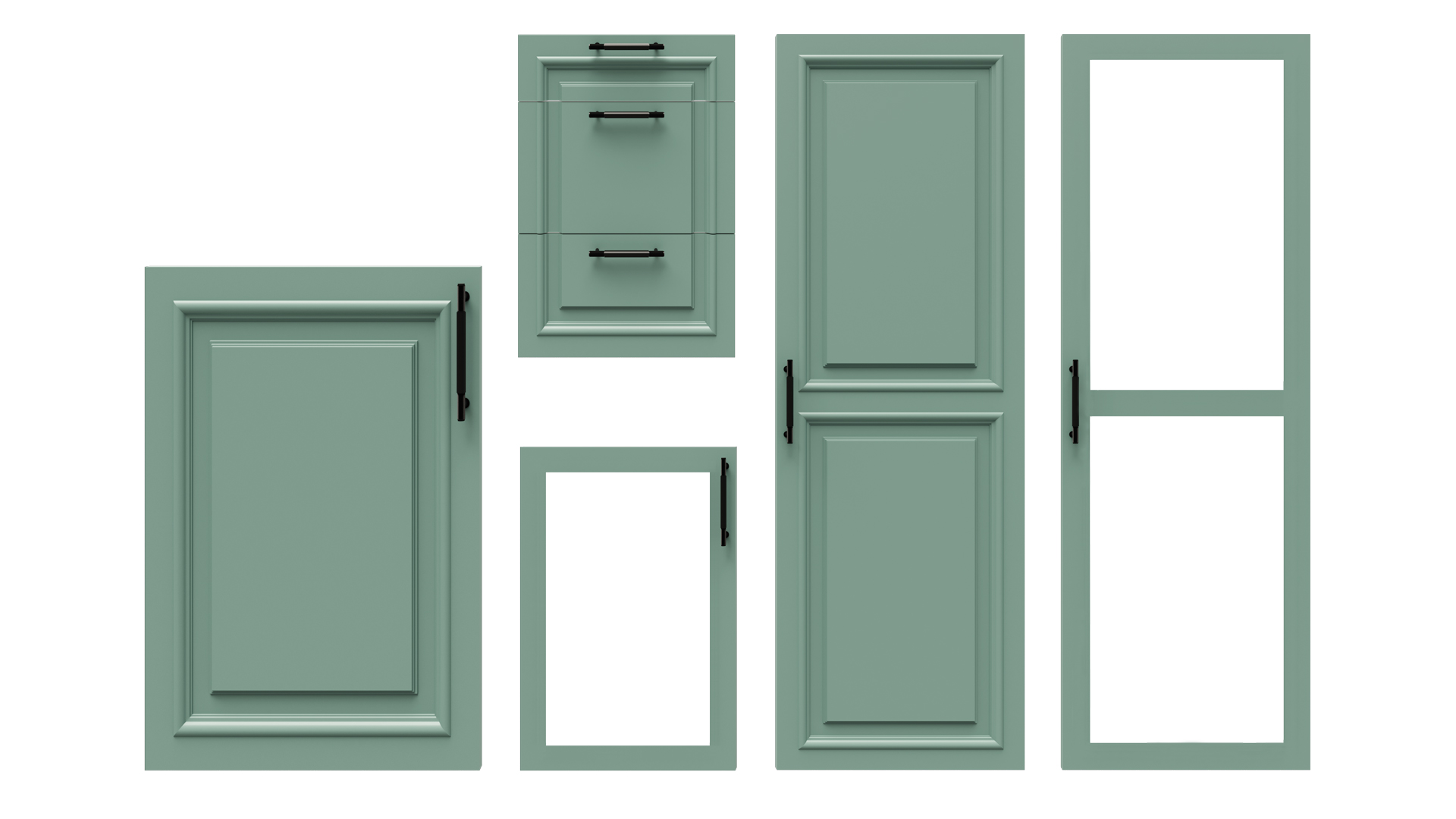 Kapak, çekmece, camlı kapak, boydan kapak ve boydan camlı kapak seçenekleri.